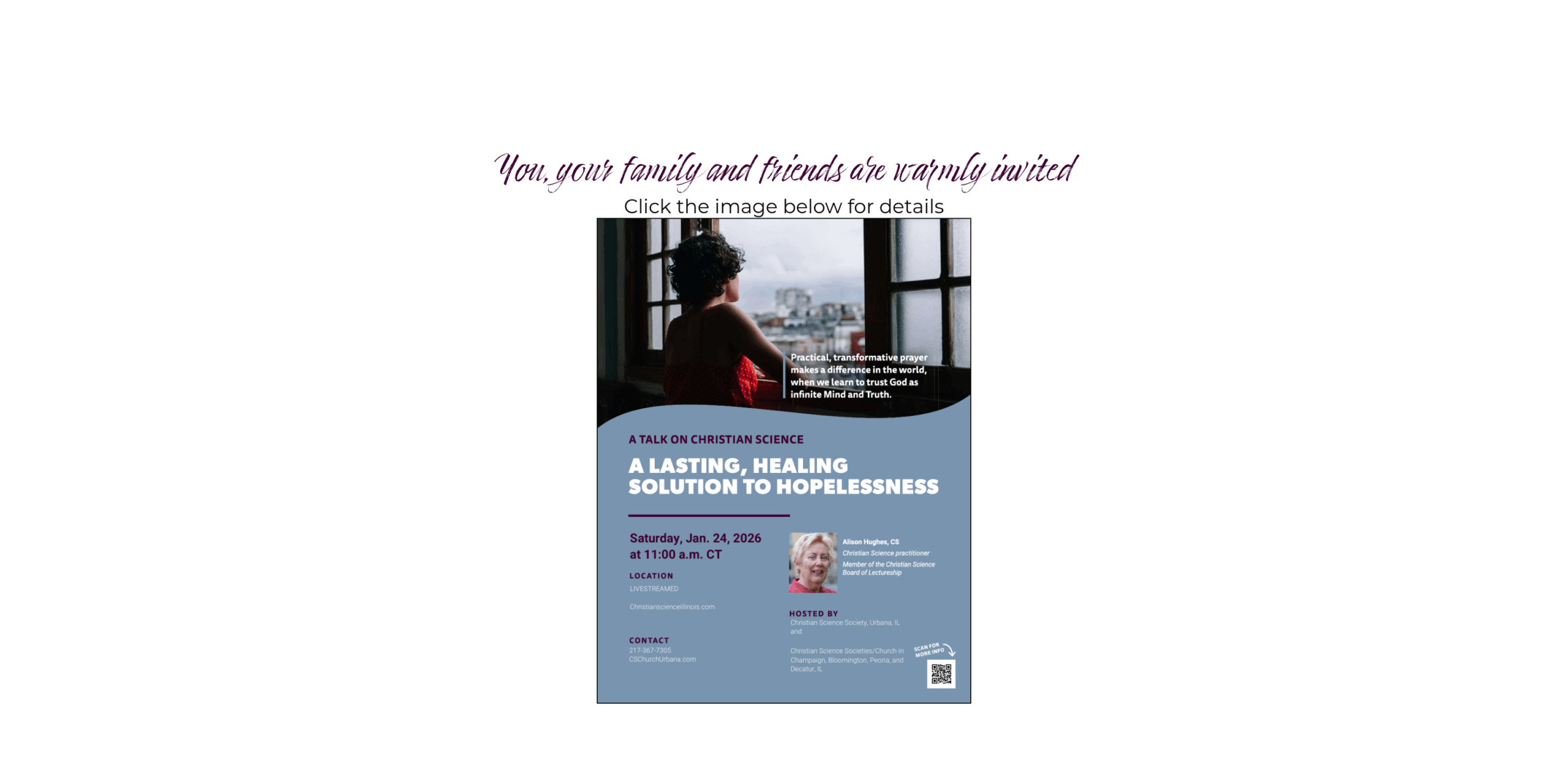 This church is of one of the branches of The Mother Church, The First Church of Christ, Scientist, in Boston, Massachusetts. Join us this Sunday at 10:30 A.M. at 510 W. William Street in Decatur. Sunday School for students up to the age of twenty begins at the same time.